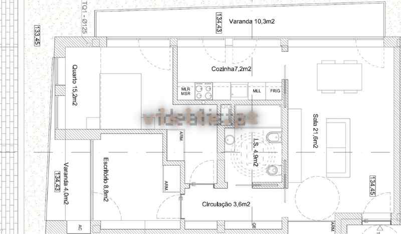 A tipologia T1+1 compreende um hall, sala de estar/jantar, cozinha, uma casa de banho, um quarto com armário embutido, um escritório embutido e duas varandas.
