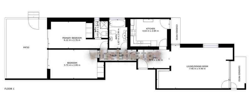 O imóvel é constituído por uma ampla sala com acesso direto ao jardim, cozinha mobilada e equipada, igualmente com acesso ao jardim.