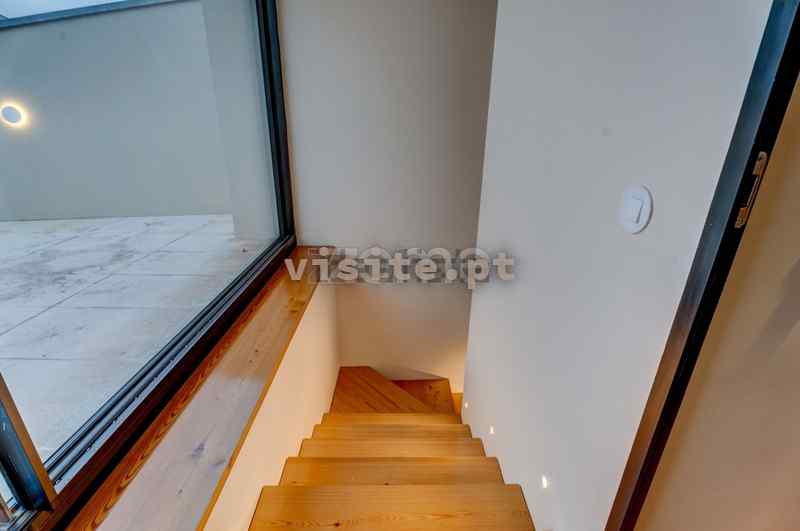 A um nível superior temos o Duplex ligado por escada revestida em madeira Riga Nova com iluminação embutida.
