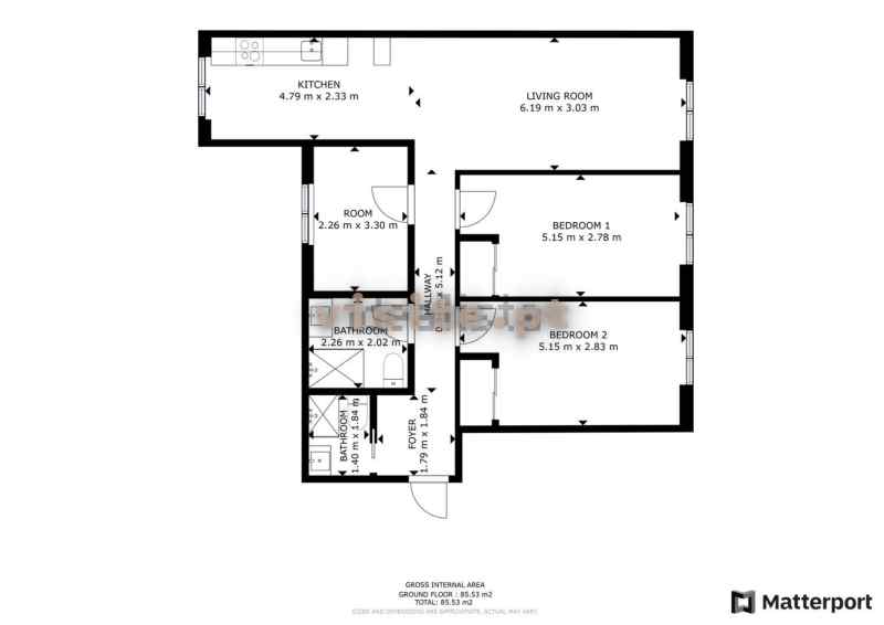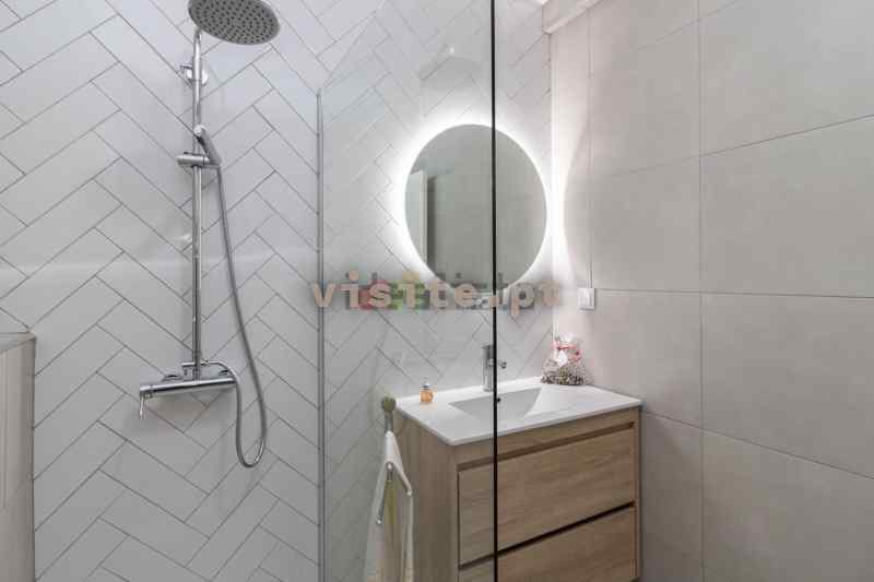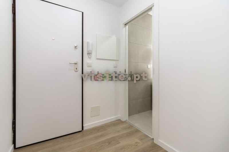 Cozinha em tons claros, semi equipada em open space com uma ampla sala de estar; duas casas de banho, ambas com base de duche, uma delas com toalheiro elétrico; dois quartos, ambos com roupeiro e um terceiro quarto, o qual pode ser utilizado como escritório ou um quarto de criança.