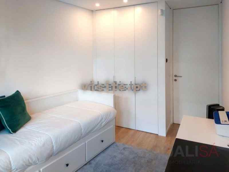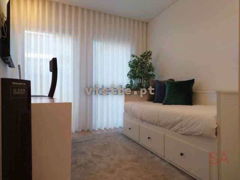 Os quartos têm roupeiros embutidos lacados a branco mate e bastante luz natural.