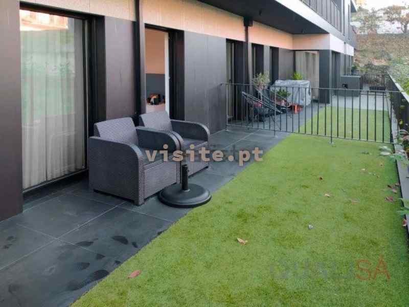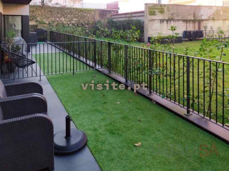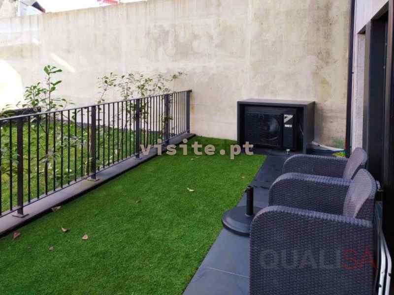 O logradouro é bastante espaçoso e tem relva sintética, sendo possível colocar uma mesa e cadeiras, criando assim uma zona de lazer aprazível.