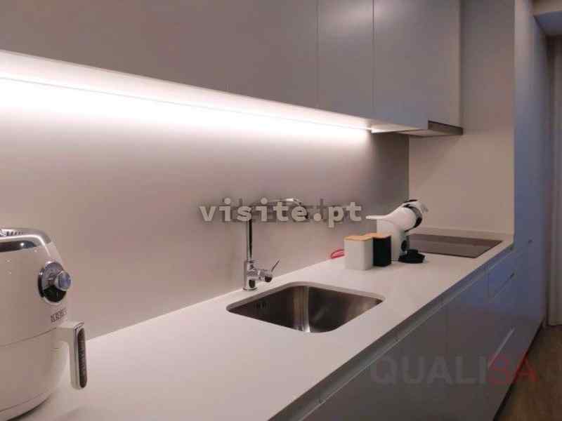 A kitchenette está equipada com máquina de lavar e secar roupa, forno ventilado, placa, exaustor, combinado, máquina de lavar loiça, micro-ondas, máquina de café e "airfryer". Com móveis lacados a branco mate, bancada com iluminação LED e tampo de balcão e contrabalcão em Quartz Design da Compac.