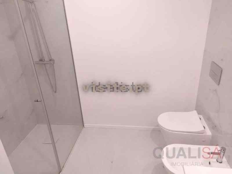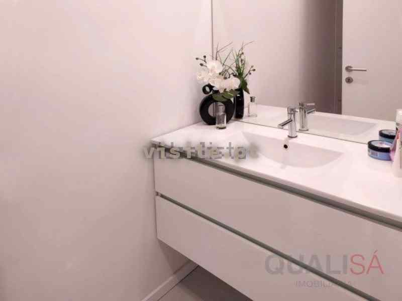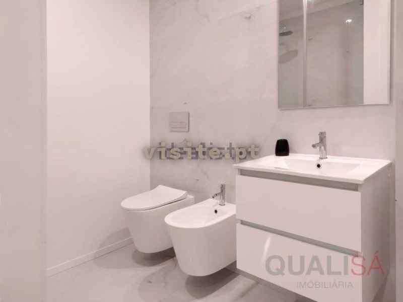 As casas de banho têm loiças sanitárias suspensas e espelho. Uma delas é de serviço e a outra é completa, com base de duche com resguardo de vidro.