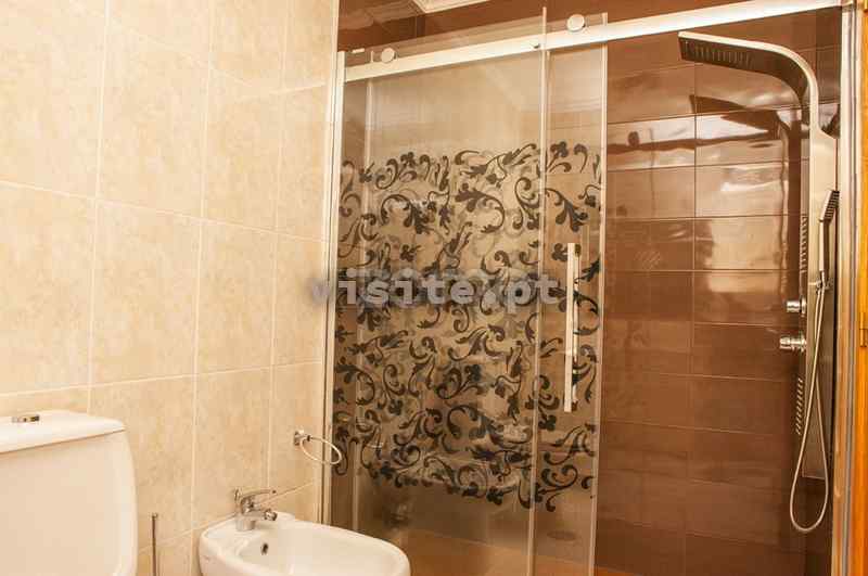 · Casa de banho da suite com móvel lavatório e espelho, bidé, sanita, duche com coluna de banho e resguardo em vidro e radiador