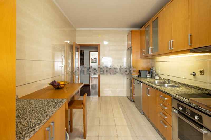 Ao entrar no apartamento temos o hall de distribuição da zona social que dá acesso a uma sala ampla, mas acolhedora, com recuperador de calor e à cozinha luminosa e espaçosa.