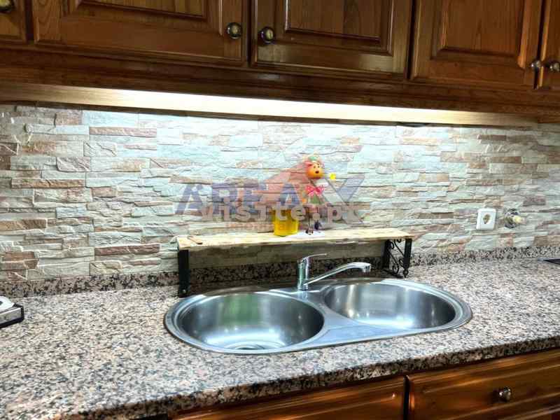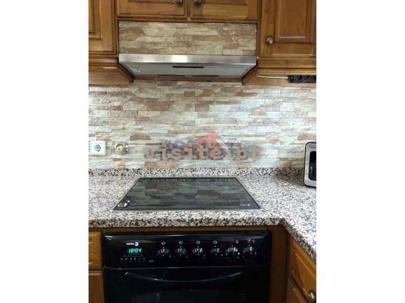 Cozinha equipada com móveis, placa, forno, exaustor e esquentador.