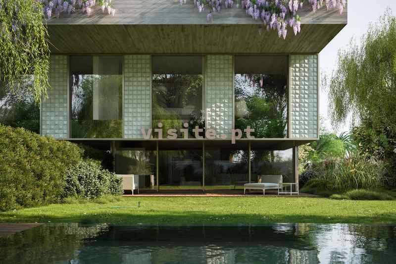 Salas em open space com acessos verticais e espaços exteriores, unidades com piscina privativa que se estende por zona coberta e descoberta.