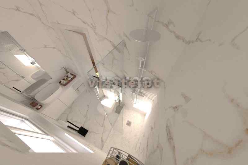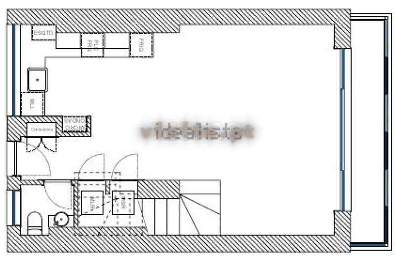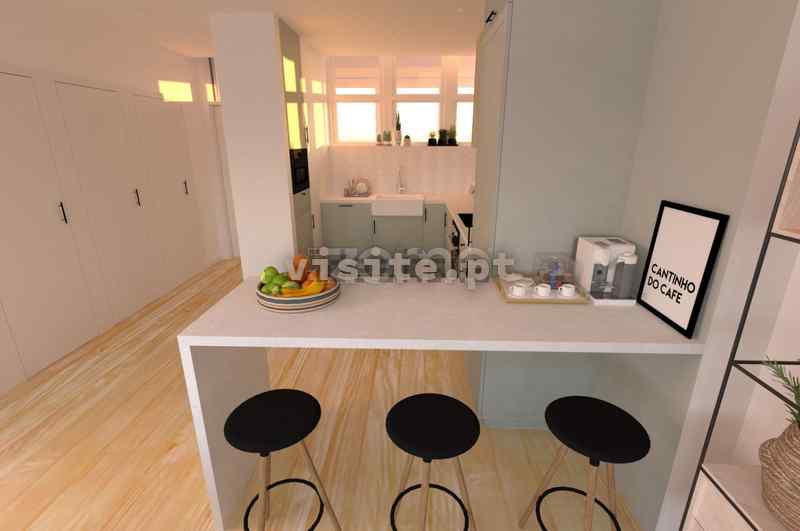 – Paredes emassadas e paredes em gesso cartonado pintadas a branco com contrabalcão em cerâmico.