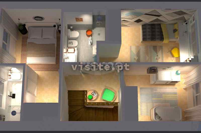 A um nível superior temos ligado por escada revestida em madeira