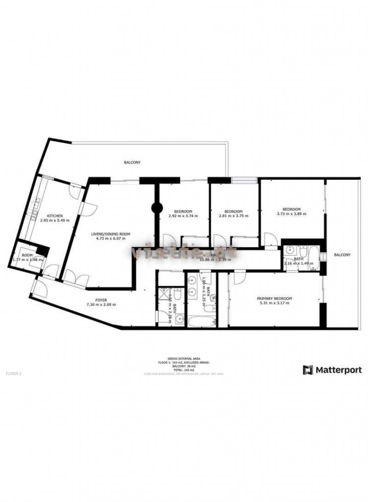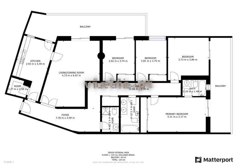 Este apartamento tem uma área habitável com 88.01 m2, uma área útil com 123.26 m2 e uma área bruta com 144.68 m2.
