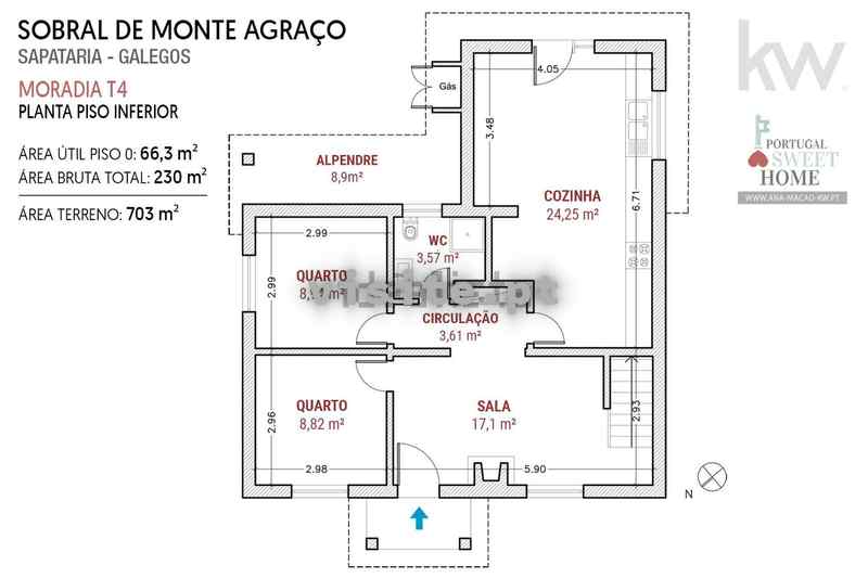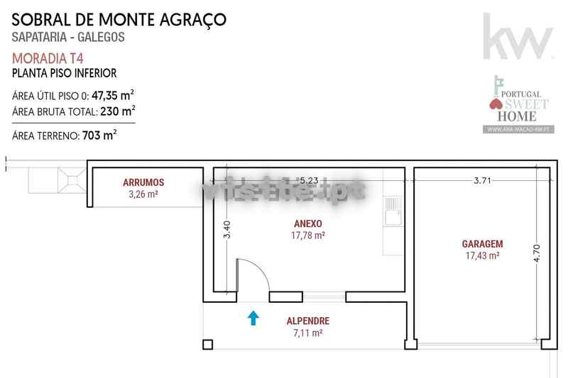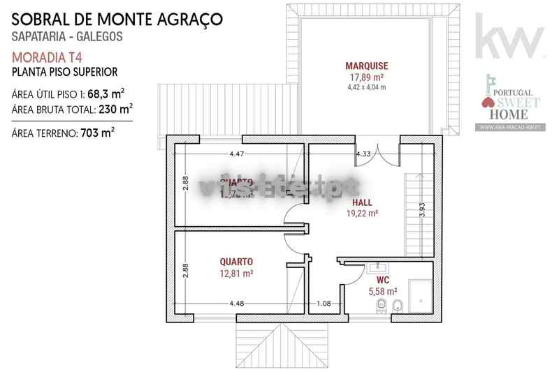 A moradia com 182 m2 de área útil e 230 m2 de área bruta total, está implantada num terreno com 703 m2, com furo de água potável e encontra-se distribuída do seguinte modo: