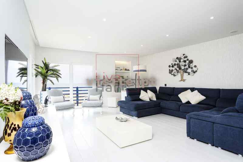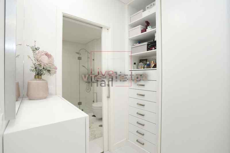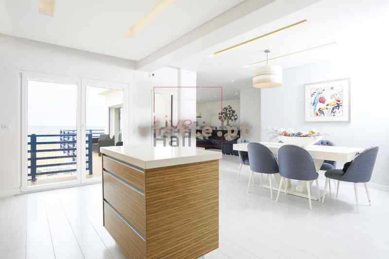 O Apartamento é composto por uma cozinha equipada e sala em Open Space com 70m2 e varanda de 17m2 com vista mar, closet, hall de entrada, corredor de acesso a casa de banho de serviço (com polibã) e lavandaria com roupeiro embutido e equipada com 2 máquinas de lavar roupa e uma de secar, hall de entrada de quartos, suite com closet e casa de banho com base de duche e móvel de WC duplo, corredor de acesso aos outros dois quartos com roupeiros embutidos e varandas e, casa de banho com banheira de hidromassagem. O Prédio dispõe ainda de um terraço de uso comum a todos os condóminos.